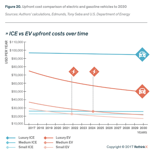 - Cost will be the most important factor affecting economic choice. The scale of the cost differential will be the key determinant of consumers choosing EVs over independently owned vehicles. See the graph below for more detail. Read p57 of our Rethinking Transportation report which sets out the basis for this assumption.